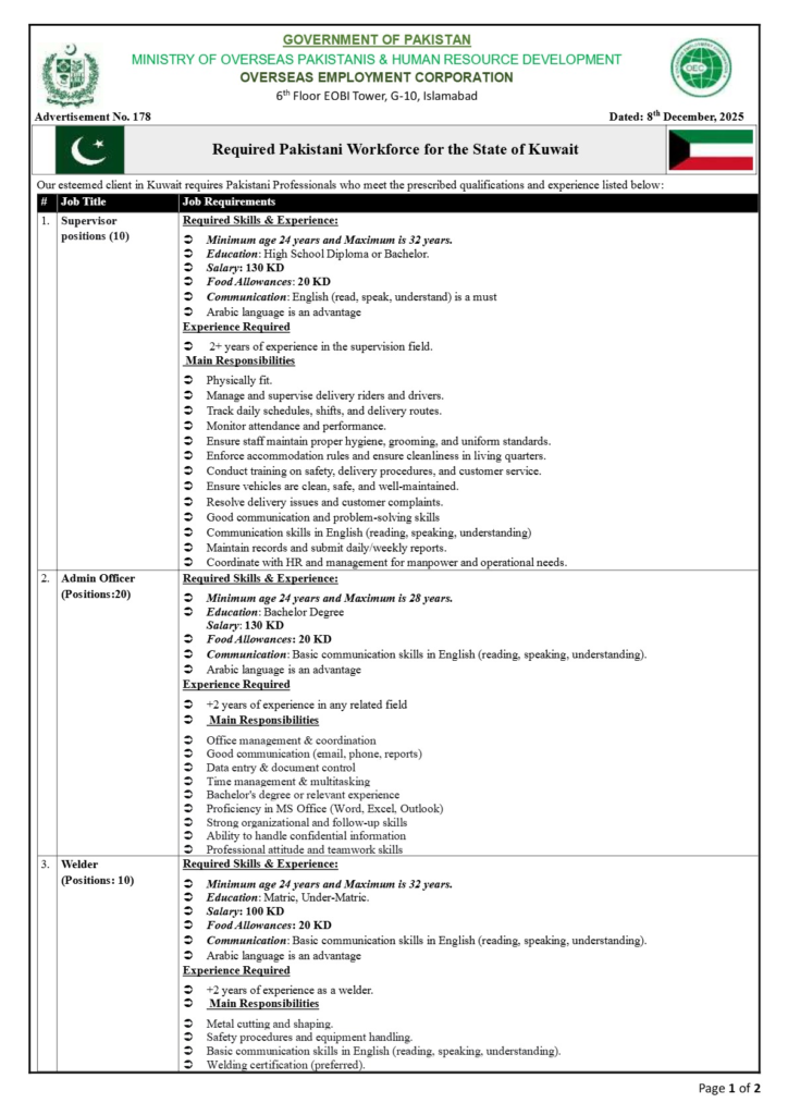 The Government of Pakistan has opened a new path for workers looking for secure and government-approved overseas jobs. The Overseas Employment Corporation (OEC), working under the Ministry of Overseas Pakistanis & Human Resource Development, has officially announced new overseas job opportunities for Pakistani workers in the State of Kuwait. These overseas jobs offer excellent salary packages, added benefits, and better working conditions, making this a true golden opportunity for those planning to work abroad.